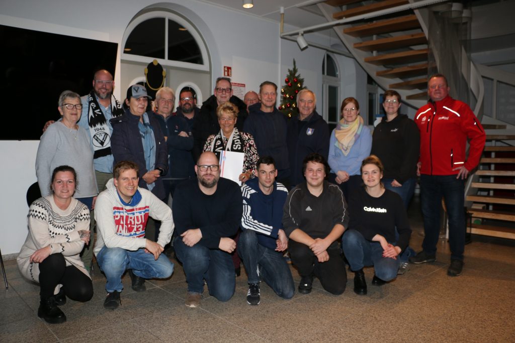 Mit der frischgebackenen „Moin! Vereinsheldin des Monats Dezember“ Christine Reimers (Mitte, mit Urkunde), die gemeinsam mit ihrem aus gesundheitlichen Gründen abwesenden Ehemann Herbert geehrt wurde, freuen sich Sven Puls (Sparkasse Holstein, stehend ganz rechts), Wiebke Watzlawek (Stiftungen der Sparkasse Holstein, stehend 3. von rechts) und Jürgen Fischer (KSV Ostholstein, stehend 4. von rechts) sowie Vereinsvorsitzender Dennis Hagge (stehend, 2. von links) und das Vorstands- und Mitarbeiterteam der Spvgg Putlos.