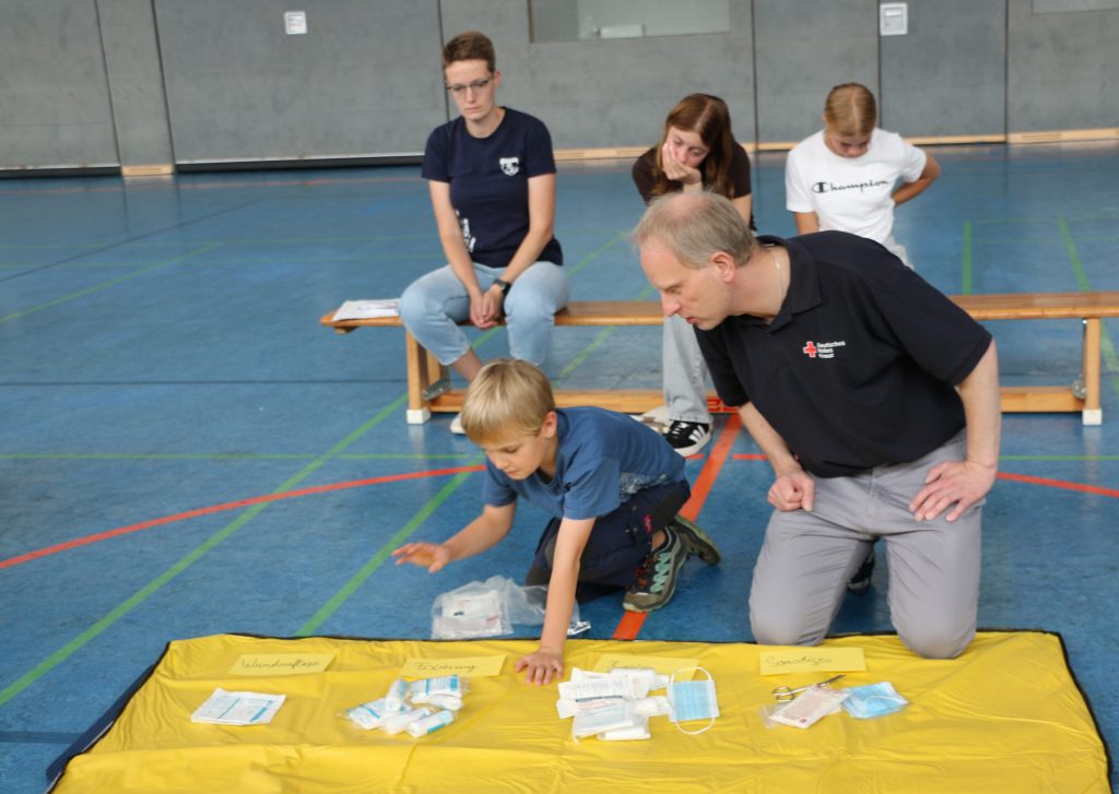 Turner Bjarne (8) unterstützt DRK-Ausbilder Stefan Post bei der Präsentation des Inhalts eines KFZ-Verbandskastens. Im Hintergrund beobachtet ATSV-Vereinsmanagerin Saskia Fischer die Szene.